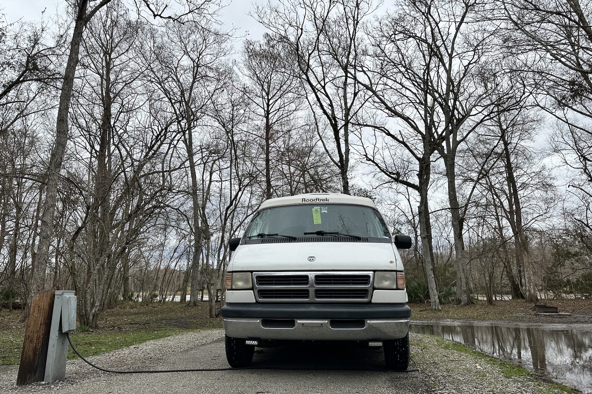The entrance gate to the State Park was a sight for sore eyes but as we arrived, the winds were howling, and the sky was spitting rain. The office staff advised us to choose any space and pay tomorrow as they were closing early due to a severe storm and tornado warning. Oh! Our current location on a remote (and low) little island in the middle of a swamp was probably not ideal under the circumstances, but it was too late now. We made up for this misfortune by finding a perfect, fully serviced site with a river view, and went about getting to the chores and admin we’d been planning all day. What could go wrong? Everything!