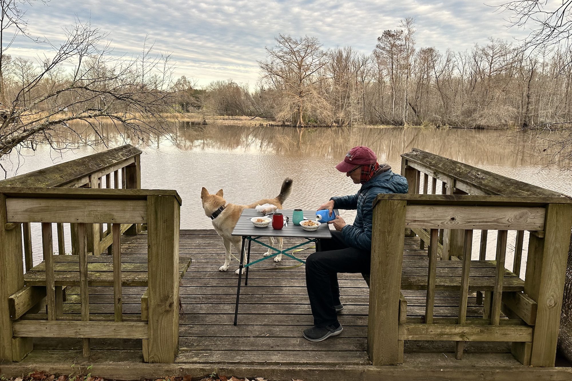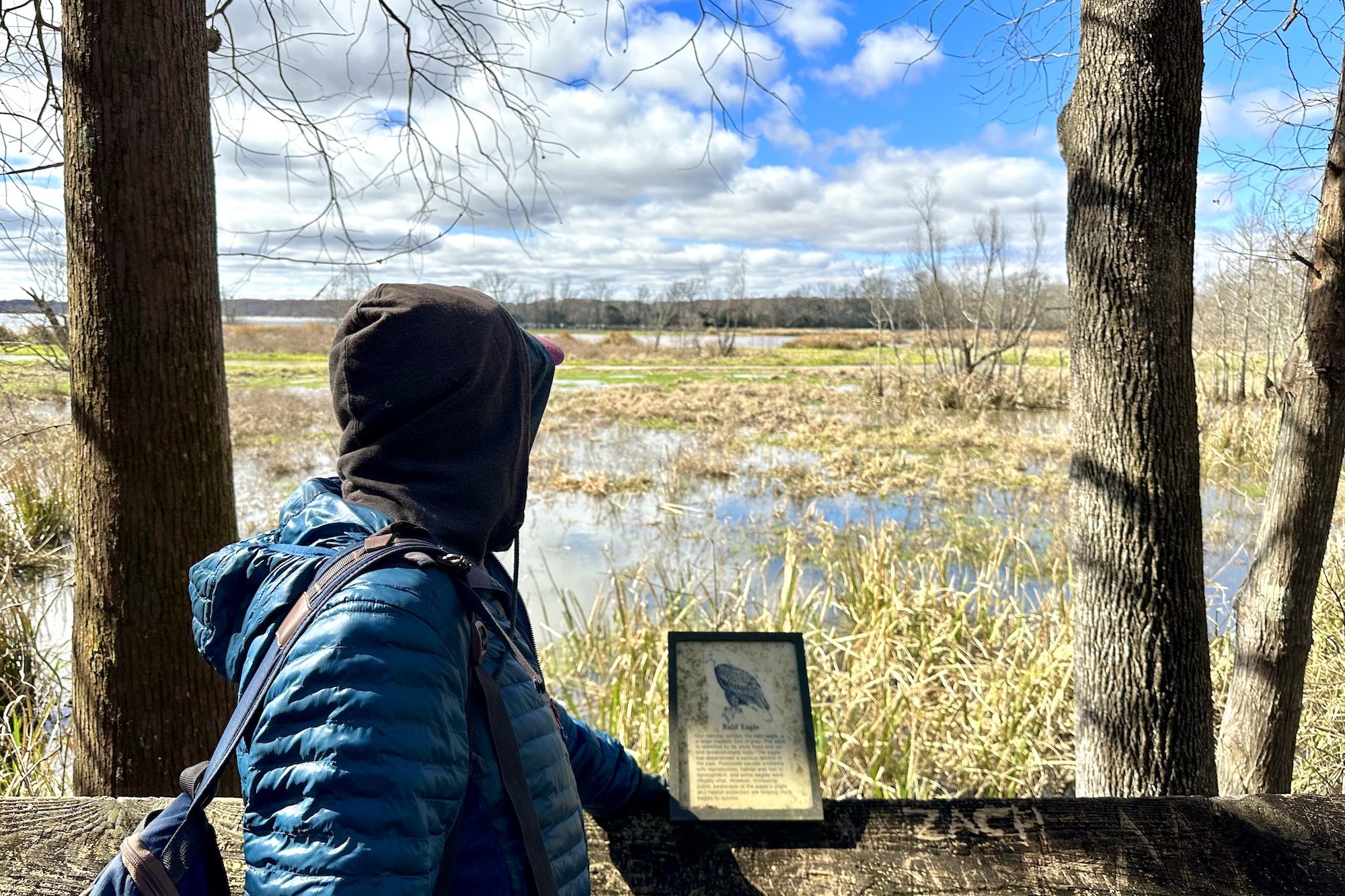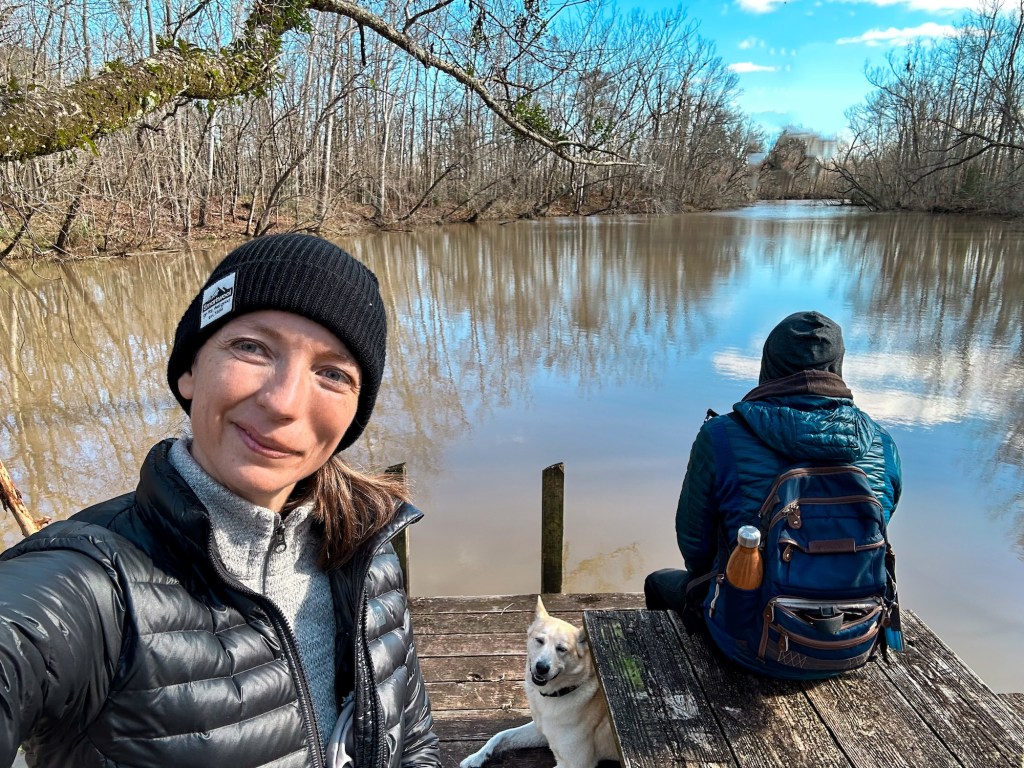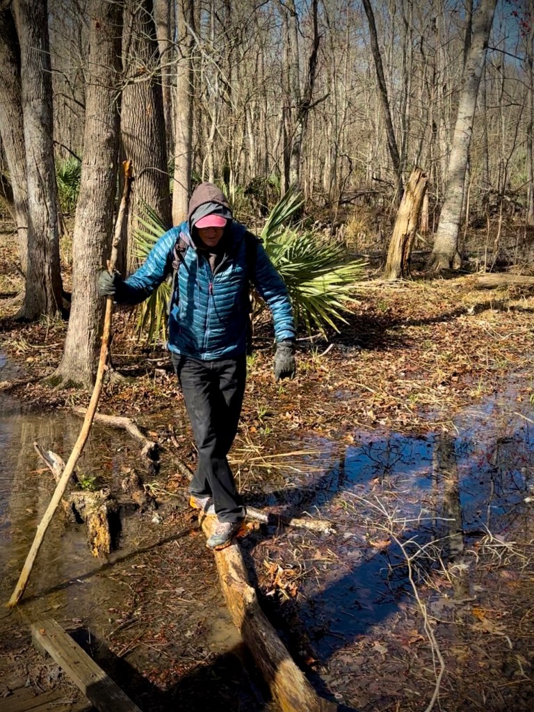 We stared intently into the bayou at every opportunity but never managed to catch a glimpse of a gator. They’re not out and about in the cold weather. We did however keep entertained by finding the nub forests, creeping vines, lots of birds, and… yup… a juvenile northern cottonmouth – one of the most venomous snakes in the US. Seeing it was both thrilling and terrifying. Hilariously, it was snoozing on some roots, surrounded by about 5 signs indicating not to sit in the roots because it was full of cottonmouths. It knows its place. We continued on with a new respect for nature and with Walter on a much tighter leash.