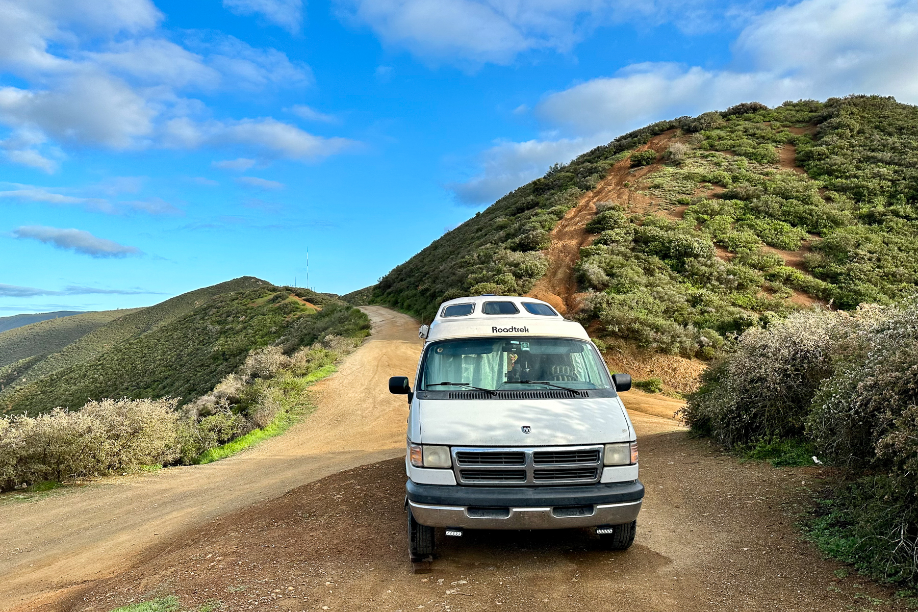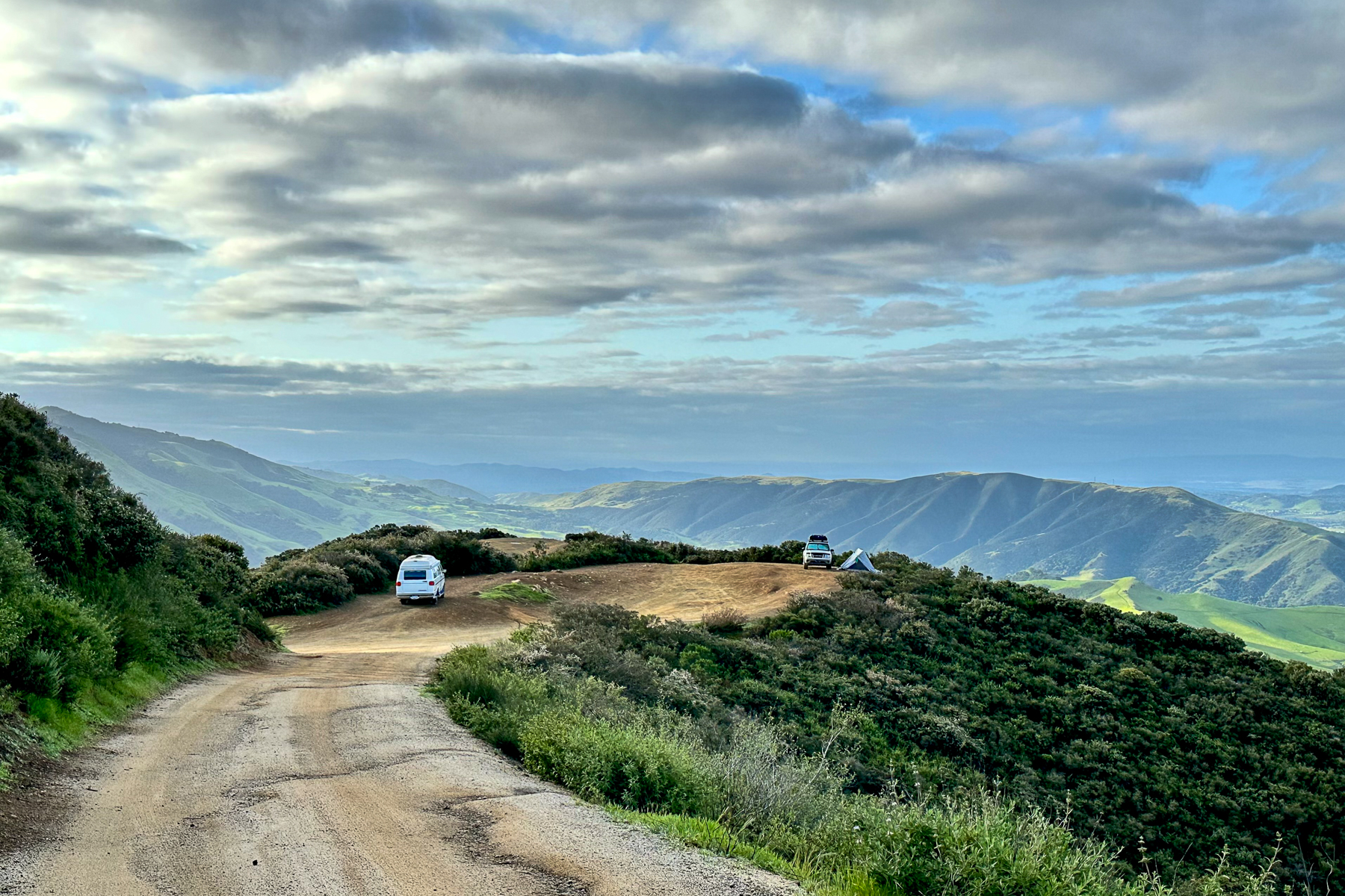 We chose to spend our first night in the free dispersed camping area along TV Tower Road, just 15 minutes out of SLO. As we climbed TV Tower Road, it turned to gravel and became worryingly steep and windy. Our GPS indicated that we were almost at our destination when we encountered a short but incredibly steep, rutted hill. Sally, our van, was not made for this terrain; perhaps I should have read the iOverlander description a little more carefully. Oops! Never one to shy away from a challenge, Sally burst up the hill with a surprising amount of gusto, cresting it while bouncing wildly, and eventually settling victoriously on top. Phew!