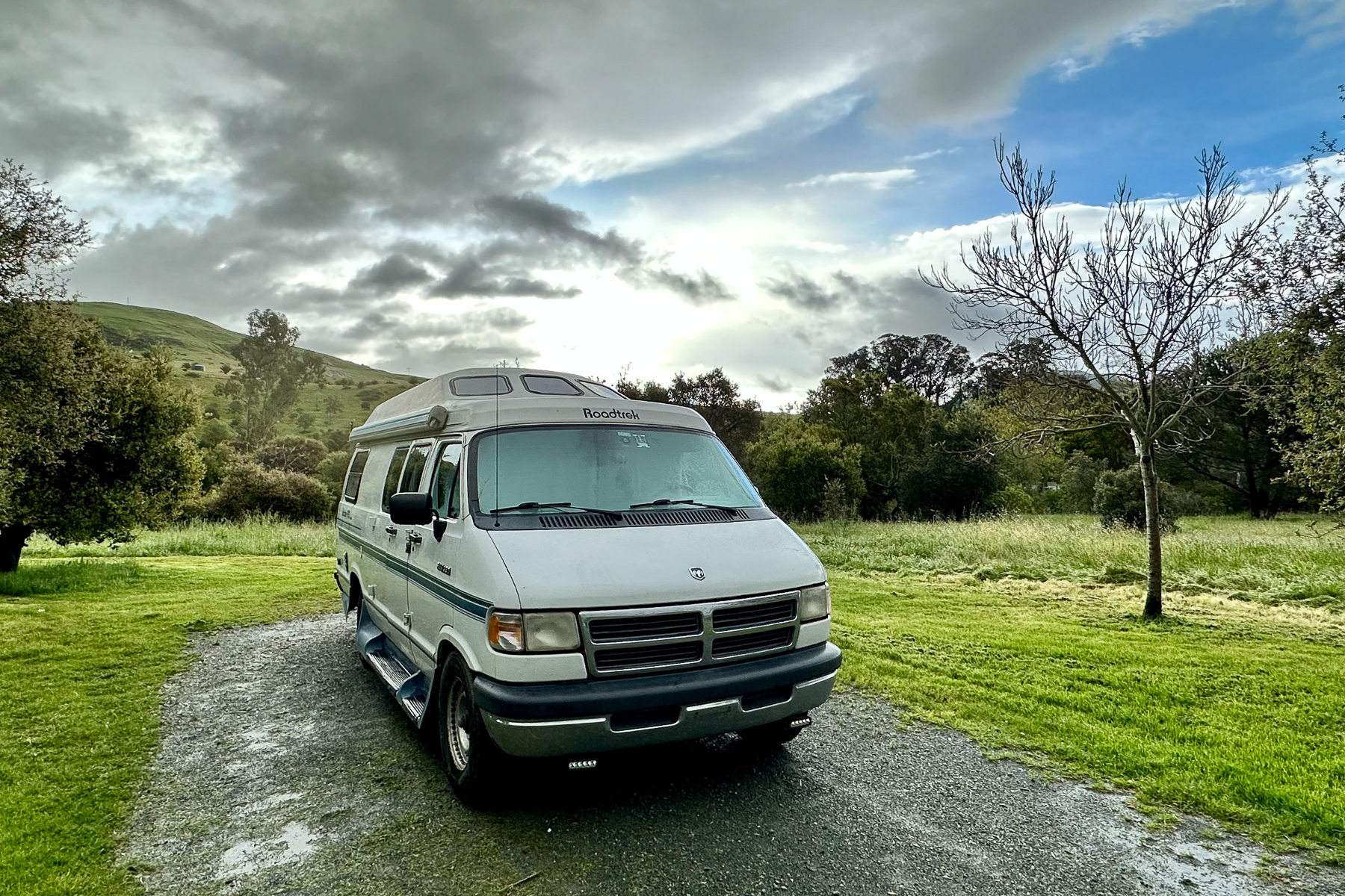 Safely down the treacherous TV Tower Road, we ran some rainy day errands and then drove to nearby El Chorro Regional Park. The weekday rate was $31 USD, which sounded reasonable for a night in a real campground. We arrived in the pouring rain to discover that it was still Spring break in California and that the holiday rate was $41 USD per night… plus a $4/night dog fee, plus a coin operated shower… so all told, $47 USD (well over $60 CDN) for a primitive campsite. Argh.
